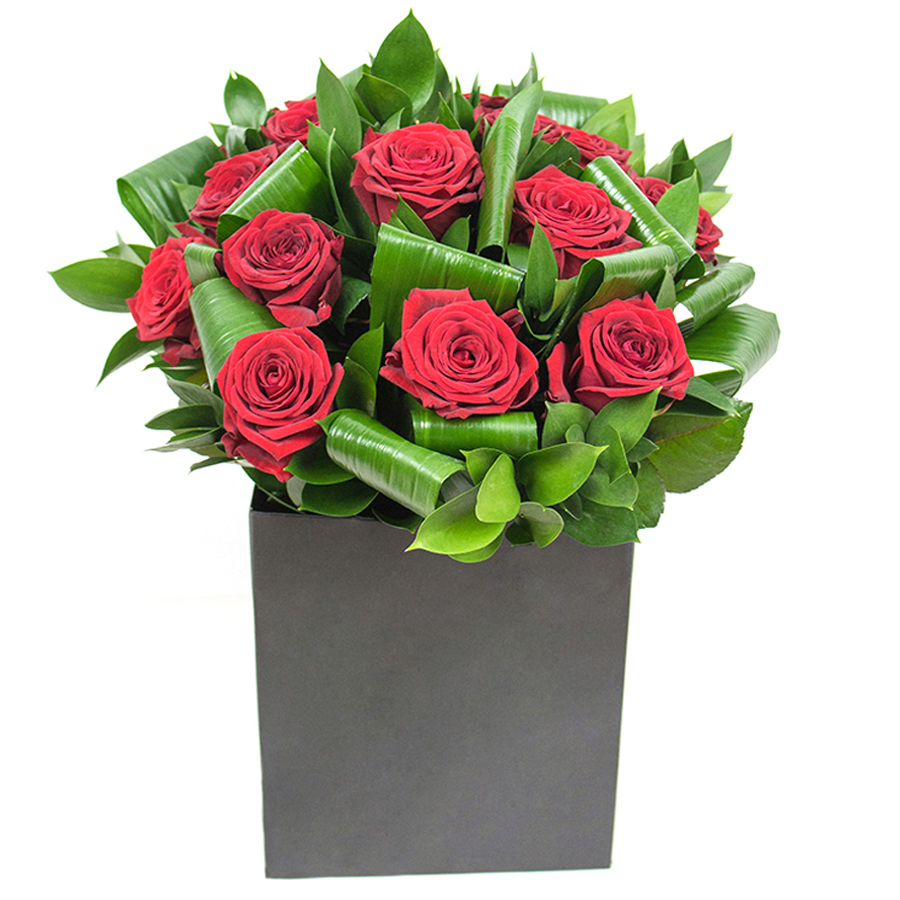 Discover the sophistication of our red rose bouquet, elegantly paired with aspidistra leaves and ruscus. This refined arrangement brings a touch of luxury and style to any space.